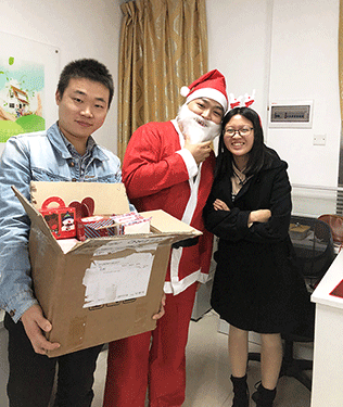 推開門走進(jìn)來,辦公室正放著悠揚(yáng)的音樂Merry Christmas,緩緩流淌的祝福溢滿了歸人的夢(mèng)境。辦公區(qū)域,慈祥的圣誕老人微笑著拿著禮物等待上班的人兒,給他們帶來一天的喜悅和祝福。