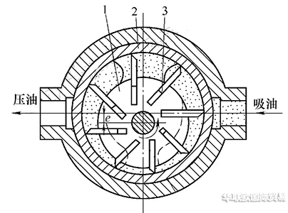 單作用BERARMA葉片泵排量計(jì)算:單作用葉片泵定子2內(nèi)環(huán)為圓,R為定子內(nèi)表面半徑;轉(zhuǎn)子1與定子存在偏心e,銑有z 個(gè)葉片槽;葉片3在轉(zhuǎn)子葉片槽內(nèi)自由滑動(dòng),葉片寬度為B;左、右配流盤銑有吸、壓油窗口。