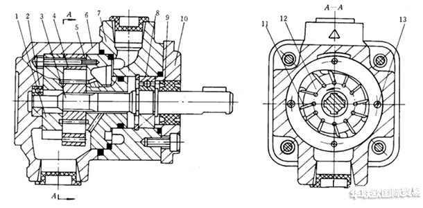 1-左配油盤;2-軸承;3-泵軸;4-定子;5-右配油盤;6-泵體;7-前泵體;8-軸承;9-油封;10-蓋板;11-葉片;12-轉(zhuǎn)子;13-緊固螺釘