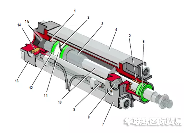 2-活塞3-緩沖柱塞 4-缸筒 5-導(dǎo)向套 6-防塵圈 7-前端蓋 8-氣口 9-傳感器 10-活塞桿 11-耐磨環(huán) 12-密封圈 13-后端蓋 14-緩沖節(jié)流閥 15-緩沖套