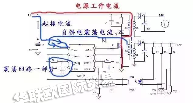 (一)、首要我們找到震動(dòng)回路;開關(guān)變壓器的主繞組N1、Q1的漏-源極,R4為電源作業(yè)電流的通路;R1供給了發(fā)動(dòng)電流;自供電繞組N2、D1、C1構(gòu)成振動(dòng)芯片的供電電壓。這三個(gè)環(huán)節(jié)的正常運(yùn)行時(shí)電源能夠震動(dòng)起來的先決條件。當(dāng)然PC1的4腳外接守時(shí)原件R2、C2和PC1芯片自身,也是構(gòu)成震動(dòng)回路的一部分。