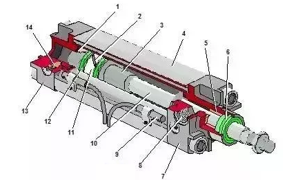 1、3-緩沖柱塞,2-活塞 ,4-缸筒 ,5-導向套,6-防塵圈,7-前端蓋,8-氣口,9-傳感器,10-活塞桿,11-耐磨環(huán) ,12-密封圈,13-后端蓋 ,14-緩沖節(jié)流閥