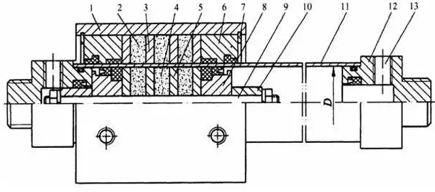 1-套筒,2-外磁環(huán),3-外磁導板,4-內(nèi)磁環(huán),5-內(nèi)磁導板,6-壓蓋,7-卡環(huán),8-活塞,9-活塞軸,10-緩沖柱塞,11-氣缸筒,12-端蓋,13-進、排氣口