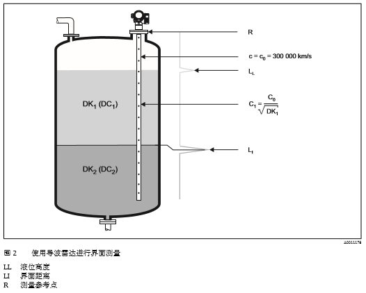 高頻脈沖信號到達介質(zhì)表面,僅部分脈沖信號發(fā)生反射。上層介質(zhì)的介電常數(shù)DC1較小時,未發(fā) 生反射的脈沖信號將沿探頭繼續(xù)向下傳播。在兩種介質(zhì)的界面處發(fā)生第二次反射(在下層介質(zhì)的介 電常數(shù)DC2大于上層介質(zhì)的介電常數(shù))?;谛谐虝r間原理可以確定儀表至界面間的距離。同時, 還需要考慮脈沖信號在上層介質(zhì)中傳播的延遲時間。介質(zhì)的介電常數(shù)(DC)直接影響高頻脈沖信號的反射率。測量大介電常數(shù)(DC)的介質(zhì)時(例如:水和 氨水),脈沖反射信號強;相反,測量小介電常數(shù)(DC)的介質(zhì)時(例如:碳氫化合物),脈沖反射信 號弱。